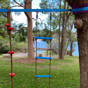 Ninja Warrior Slack Line Course can be set up between two trees or anywhere with two fixed points. The height can be adjusted to suit your child and the attachments you are using.